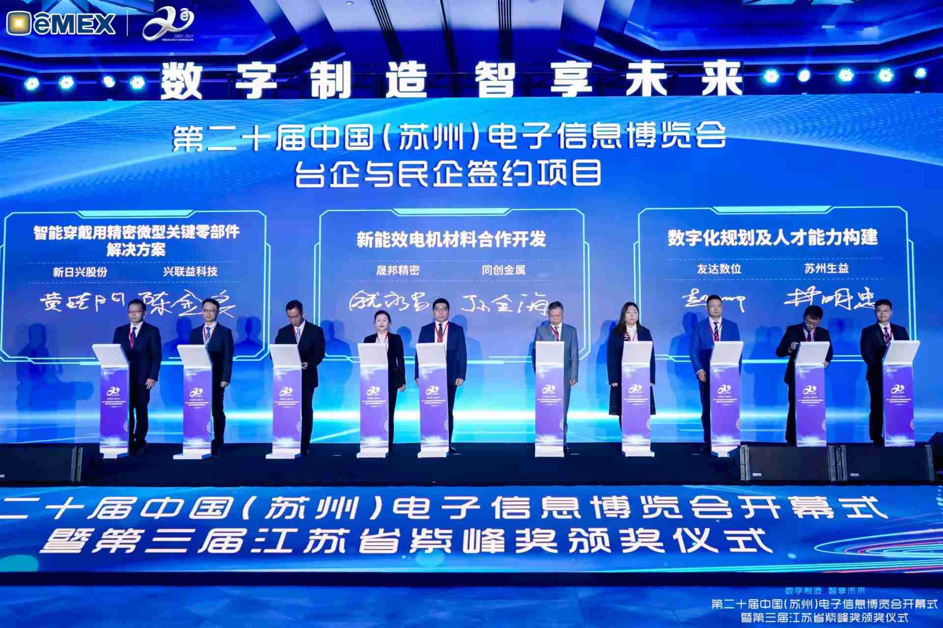 电博会开幕式当天也是第三届江苏省紫峰奖颁奖仪式,,,省台办、、、、工信厅、、、、商务厅、、、、苏州市相关领导均出席并颁奖。。该奖项为表彰对江苏高质量发展做出积极贡献的在苏企业,,,由江苏省政府专门设立。。。。人生就是博光电 (苏州) 总经理郭振明代表上台领奖,,这也是人生就是博苏州连续三次蝉联紫峰奖 出口贸易领军企业奖。。。人生就是博数位总经理赵丽娜女士,,也参与本次开幕式,,,,上台为本地化赋能签署战略合作协议,,,,将优质服务资源集合、、、、下沉到更多细分行业,,,为更多地区的制造企业提供数字化转型服务。。